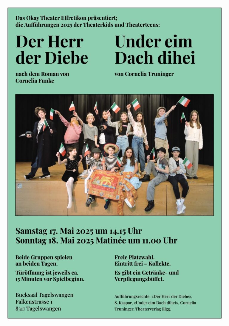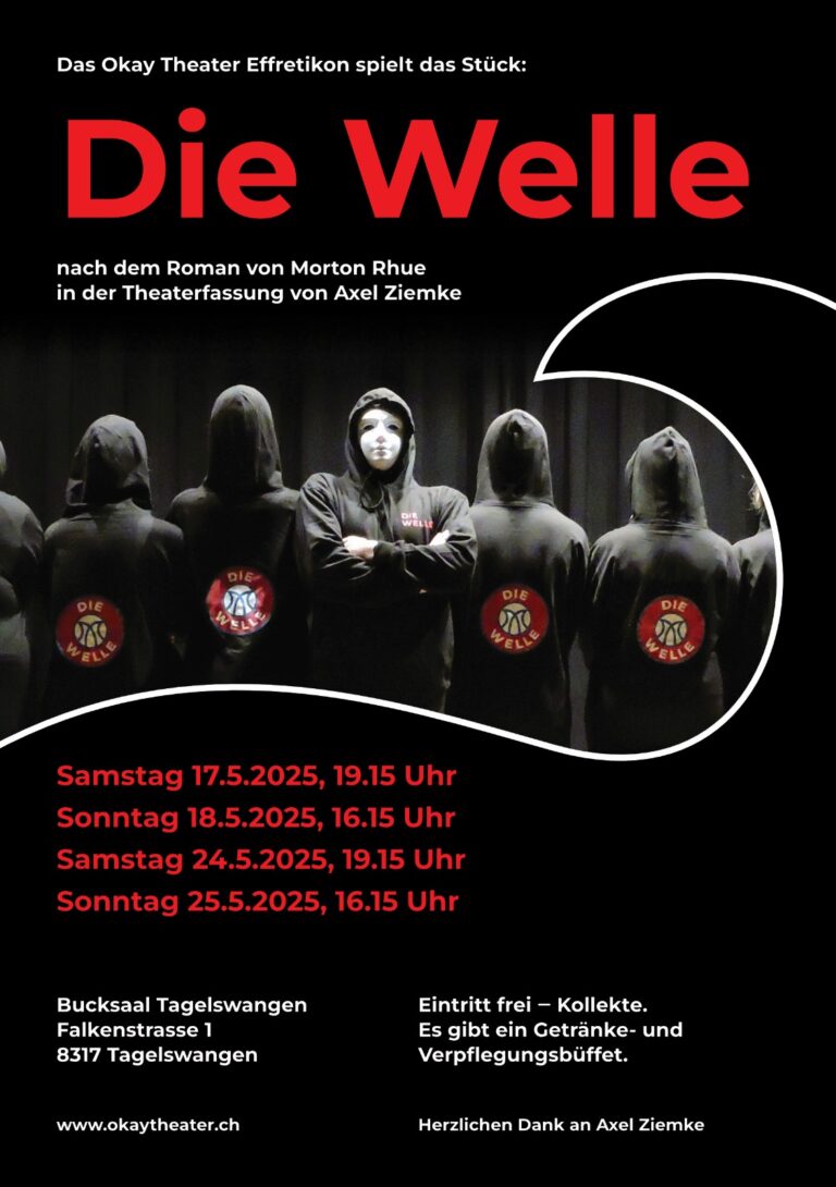Okay Theater Aufführungen 2025: Die Gestaltung der Flyer- und Plakatkampagne der Aufführungen meines Theatervereins. Meine Gruppe führte «Die Welle» auf, für die Welle habe ich ebenfalls das Logo und das Design der Requisiten (Wie zB. die Pullover) gestaltet.